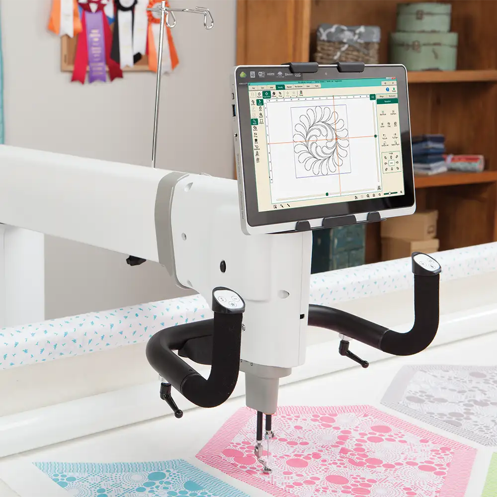 - 11-inch color touchscreen computer mounted on the stitch-regulated quilting machine